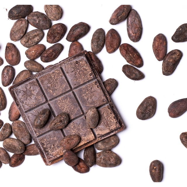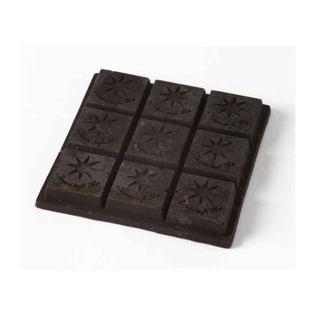 Barretta di cioccolato artigianale in formato quadrato, ottenuta a partire da massa di cacao al 50%, realizzata con fave di cacao provenienti dal Venezuela e macinate a pietra, miscelata a freddo a zucchero di canna grezzo Demerara e sale marino integrale di Trapani.